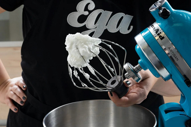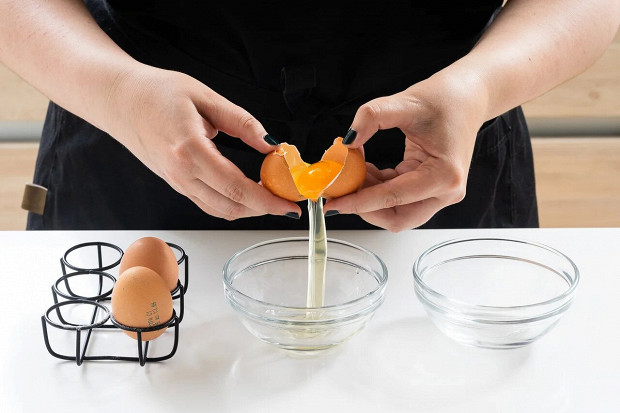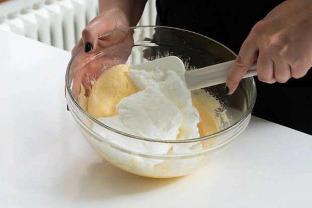 Лопаткой смешайте белки с желтками, стараясь не потерять объема.