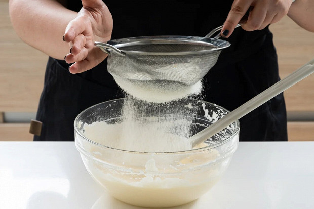 Муку (1 стакан) просейте и вмешайте в тесто.
