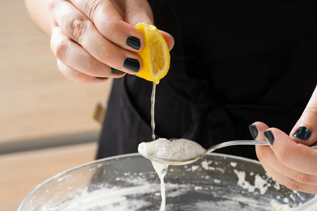 Соду на кончике ножа погасите лимонным соком и добавьте в тесто. Снова перемешайте тесто лопаткой.