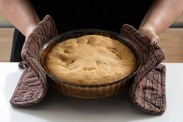 Выпекайте шарлотку в разогретой до 180 градусов духовке 45–50 минут. Проверьте готовность шпажкой: если она выйдет чистой, шарлотка готова.