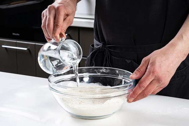 В большой миске смешайте 500 г муки, дрожжи, чайную ложку сахара и соль. Медленно влейте 360 мл теплой воды, продолжая перемешивать массу деревянной ложкой.