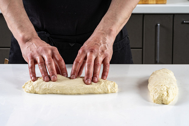 Переложите тесто на слегка посыпанную мукой рабочую поверхность и разделите на две равные части. Слегка присыпьте обе части мукой и подверните края теста внутрь, придав им форму овальных буханок. Накройте заготовки чистым кухонным полотенцем и дайте расстояться в течение часа.