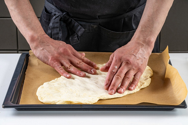 Положите лист пергаментной бумаги на противень и переложите одну часть теста диагонально на противень. Растяните тесто руками вдоль и по диагонали до двух углов. Продолжайте растягивать все края, чтобы придать тесту форму плоской овальной лепешки. Не обязательно идеально ровно, но важно, чтобы слой был равномерным.