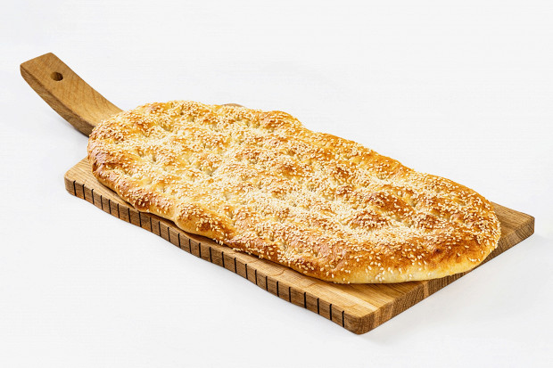 Посыпьте лепешку семенами кунжута и отправьте в духовку на 20 минут до легкого золотистого цвета. Пока первая лепешка выпекается, подготовьте вторую к выпечке точно так же.