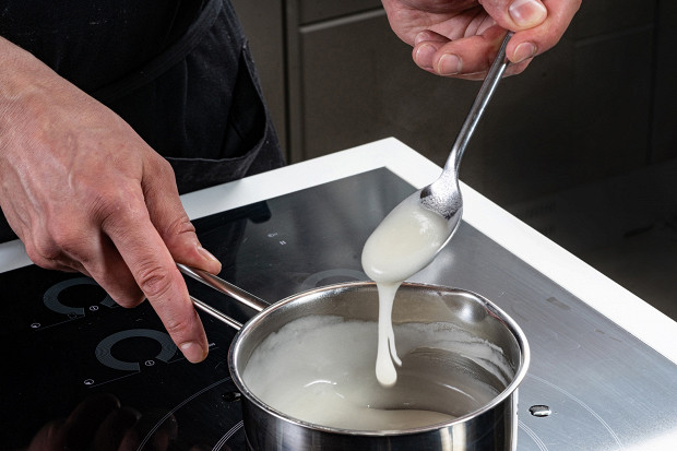 Тем временем разогрейте духовку до 200 градусов и приготовьте глазурь. В небольшой сотейник влейте 80 мл воды, добавьте 1 столовую ложку муки и сахар, поставьте на небольшой огонь. Варить, взбивая венчиком, несколько минут, пока глазурь не приобретет консистенцию киселя. Снимите с огня, чтобы она остыла.