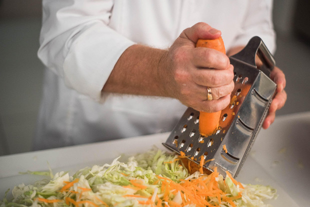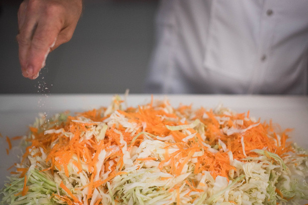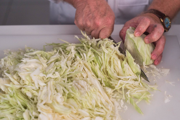 Затем капусту надо нашинковать. В «ЦДЛ» я пользовался ножом для шинковки капусты, специально его заказывал, так быстрее получалось. Очень тонко или очень толсто шинковать не надо. Выбирайте золотую середину.