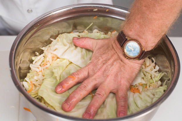 Через час-два надо снова открыть капусту, запустить туда руки и поворошить, чтобы газы все вышли. И так нужно делать три дня подряд. Все это время капуста находится в комнатной температуре.