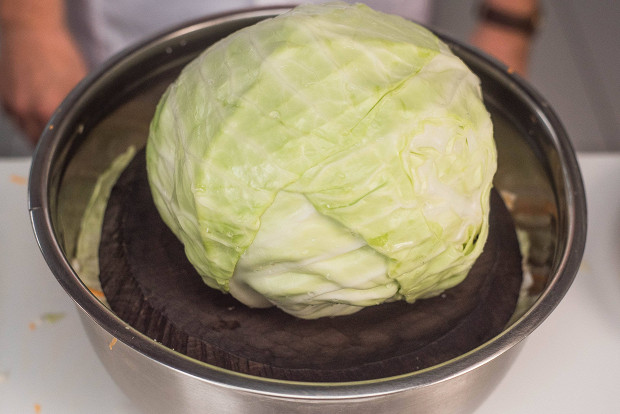 Гнет не должен быть большим и тяжелым, иначе он начнет выдавливать сок, капуста получится сухой, хотя при этом рассола будет много. У моей бабушки был камень-голыш. Голыш — потому что гладкий. Ей он достался от ее мамы и так далее. Мы же положим в качестве груза кочан капусты — он в меру тяжелый, но не слишком, чтобы выдавить весь рассол. Вы можете поставить сверху миску с водой, например, — примерно литр. И сверху все лучше накрыть марлей, чтобы ничего лишнего в капусту не попало.