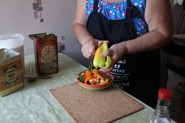 Перцы надо почистить — убрать внутреннюю часть — и разрезать на несколько частей вдоль. Если внутри останется немного семян — ничего страшного и даже хорошо: от них будет больше аромата.