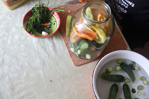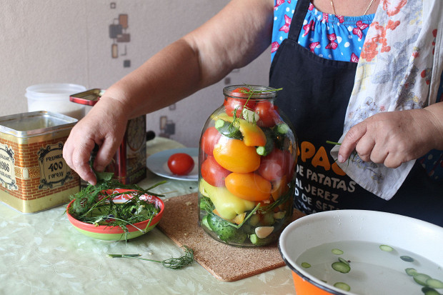 Пропорции овощей — просто на глаз. Сколько у тебя есть огурцов, сколько помидоров, — столько и кладешь. Обычно бывает так: огурцы уже кончаются, а помидоры только начинаются. Поэтому сначала в банках больше огурцов, а потом — больше помидоров. Перцев много класть не надо, один, ну, может, два на трехлитровую банку. По крайней мере, для Арзамаса это роскошь — много перца класть, его у нас не так много растет.