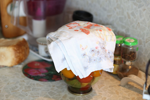 Затем нужно перевернуть банку крышкой вниз и накрыть полотенцем. Одеялом не нужно, полотенца достаточно для мягкости остывания (но если я закатываю одни помидоры, то тогда накрываю их одеялом). Потом убрать овощи в прохладное темное место. Есть их можно будет через 40 дней.