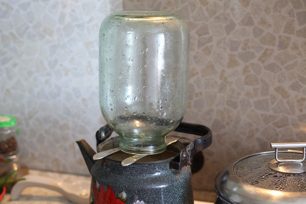 Непосредственно перед закладкой нужно простерилизовать банки. Я делаю это так: ставлю чайник с водой на плиту, на него кладу две вилки. Вода доводится до кипения, я ставлю на них банку, и она стоит так минут 15.