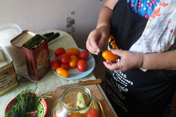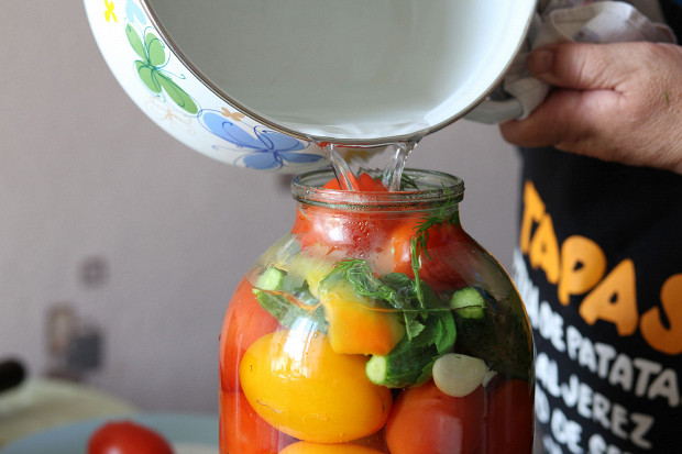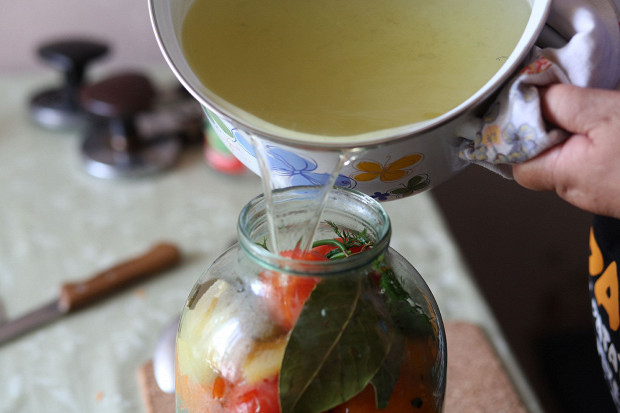 Если я мариную одни помидоры, я заливаю их кипятком только один раз, а потом рассолом — и закатываю. Если же одни огурцы — непременно два раза. То же самое делаю и с ассорти, из-за огурцов.