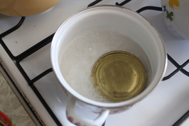 Теперь нужно простерилизовать крышку: залить небольшим количеством воды, довести до кипения и подержать минуты 2–3.