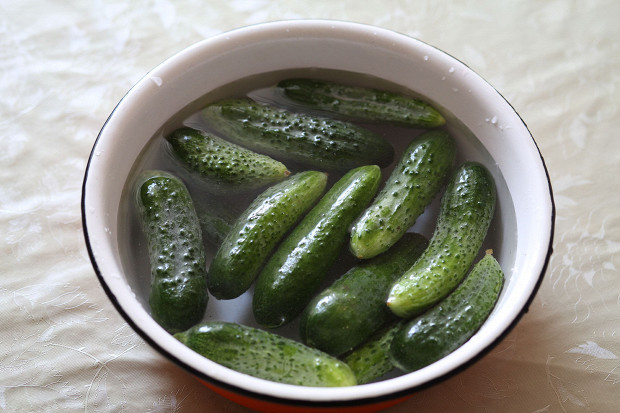 Огурцы надо сначала хорошо помыть и замочить в холодной воде. Это нужно для того, чтобы они взяли в себя воду и получились в банке ровненькими, не морщились. Если огурцы свежесорванные, я замачиваю их на полчаса, если полежали уже, то часа на два.