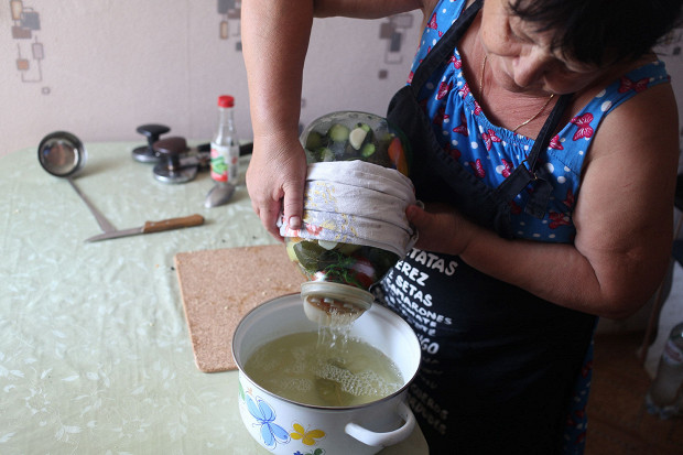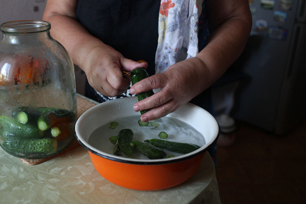 Соль нужна крупная, и лучше, чтобы на пачке было написано, что она годится для посола. Вообще, самая лучшая для консервирования — донецкая соль, украинская, на которой написано «С iль». Но вот в прошлом году она была еще в магазинах, а сейчас ее нет.