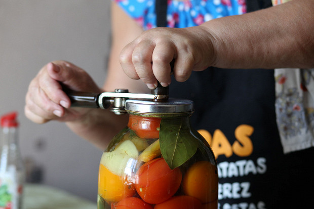 Теперь закатка — самый ответственный момент. Прижимаешь плотно машинку к банке и закатываешь, пока не почувствуешь, что уже все, дело готово.