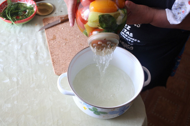 Когда вскипит, снова залить овощи в банке — и снова оставить на 20 минут под крышкой.