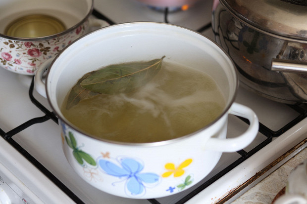 Тем временем перелить отставленный кипяток в кастрюлю и всыпать 4 столовых ложки сахара и 2 столовых ложки соли, а также добавить пару мытых лавровых листьев и по 4 горошины душистого и черного перца, тоже мытых.
