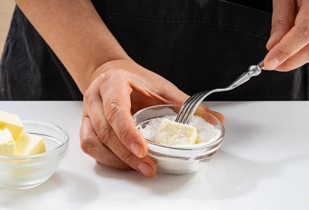 Большой кусок сливочного масла наколите на вилку и опустите в морскую соль.