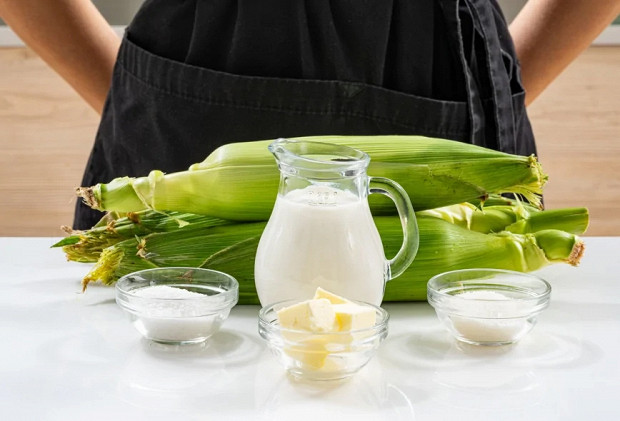 Подготовьте все ингредиенты. Кукуруза, чтобы получиться вкусной, должна вариться в достаточном количестве воды. Поэтому на 4 початка нам понадобится 3 литра воды и стакан молока (оно и придаст кукурузе особый вкус). Возьмите пачку сливочного масла (кукурузу маслом точно не испортишь), пару ложек сахара и запаситесь крупной морской солью, ею натирать кукурузу вкуснее.