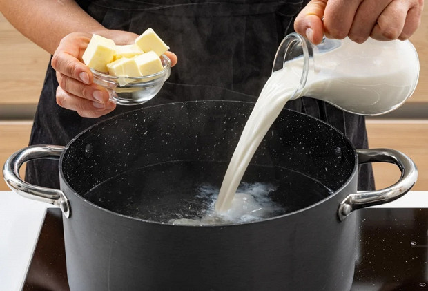 Влейте в воду молоко и добавьте грамм 50 сливочного масла. Подождите, пока масло разойдется по кастрюле.