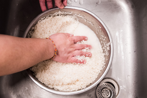 Главное — сохранить текстуру и целостность зерна. Надо набрать немного прохладной воды, на половину объема риса, и, аккуратно нажимая на него ладонью, протирать круговыми движениями по часовой стрелке. С таким нажимом, как вы пыль дома стираете с полок.