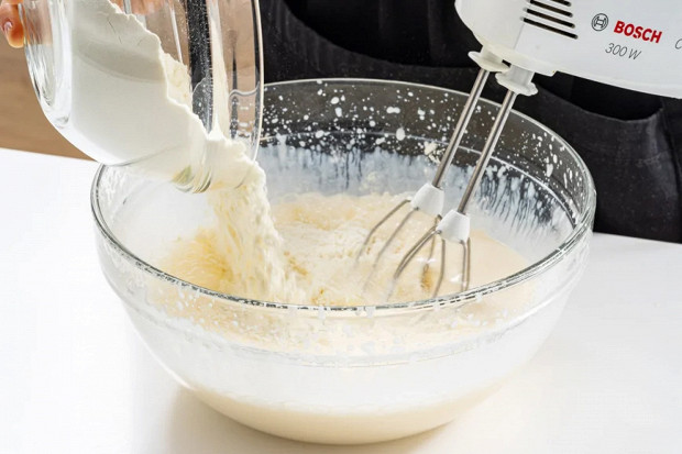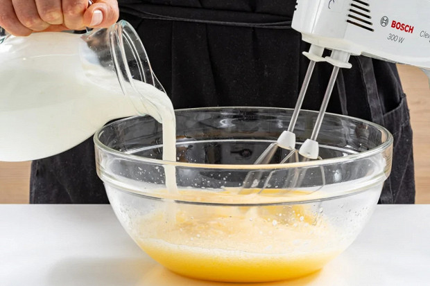 Продолжая взбивать, медленно влейте кефир. Медленно — чтобы тесто замешивалось равномерно, без комочков.
