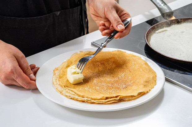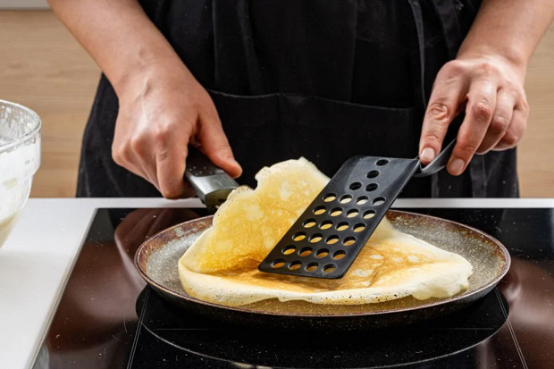 Когда краешки блина подрумянятся, переверните его и дожаривайте на другой стороне в течение 20–30 секунд. Тут очень важно использовать лопатку, причем в идеале — широкую лопатку, которая удержит блин, поможет ему правильно перевернуться, не порвав края и не потеряв форму.