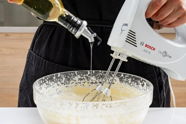 В конце вмешайте в тесто растительное масло. Это может быть и подсолнечное рафинированное масло, и любое другое — опять же рафинированное и лишенное запаха.