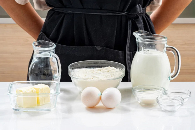 Подготовьте все ингредиенты: пол-литра кефира любой жирности, два куриных яйца, 200 г пшеничной муки, 30 г сахара, ½ чайной ложки соды, ¼ чайной ложки соли, 30 мл растительного масла, 250 мл воды, 50 г сливочного масла и сметана, взятая по вкусу.