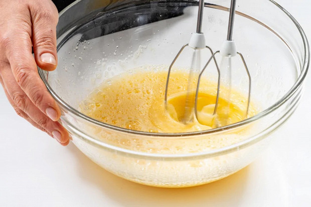 В большой миске взбейте яйца комнатной температуры, соединив их с солью и сахаром и взбив до легкой, но устойчивой пены.