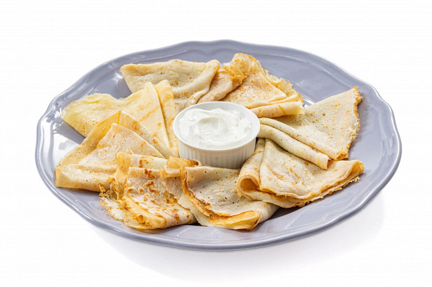 Подавайте блины со сметаной или другими любимыми топпингами: это могут быть и свежие ягоды, и варенье, и форшмак, и красная икра, и все что угодно — эти блины станут универсальной поддержкой для любой начинки. А можно и без начинки вовсе: например, съесть блины, как в детстве, посыпав их сахаром.