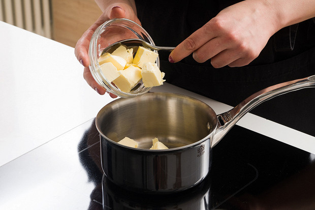 Сливочное масло (90 г) нарежьте кубиками, выложите в сотейник и, помешивая, растопите на небольшом огне. Огонь не должен быть слишком сильным, чтобы масло не начало подгорать, это испортит все дело. Дайте маслу остыть до комнатной температуры.