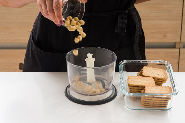 Небольшую горсть (30 г) орехов (мы использовали жареный фундук, но можно использовать грецкие орехи или арахис) измельчите блендером в мелкую крошку.