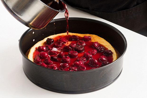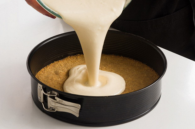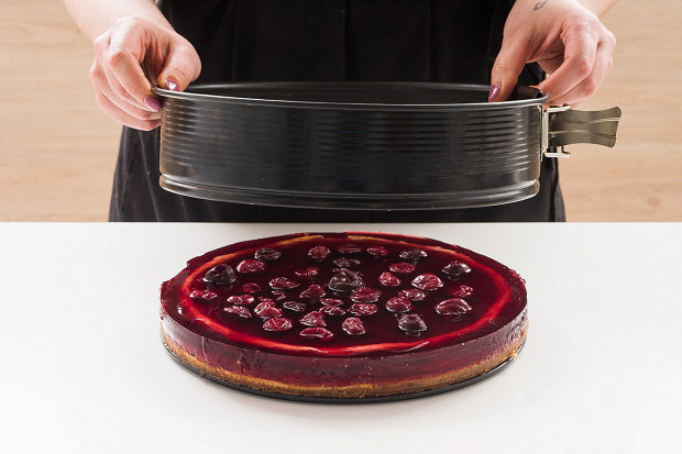 Готовому чизкейку дайте остыть в форме и уберите в холодильник на 3 часа.