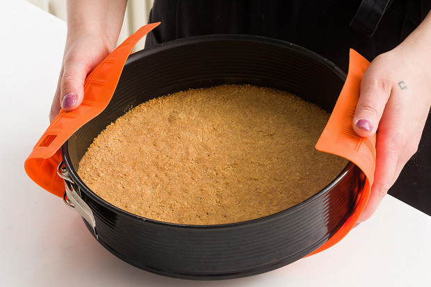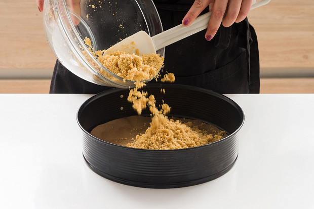 Застелите разъемную форму диаметром 24 см пергаментом, выложите в нее крошку и прокатайте стаканом, чтобы получился ровный, плотный корж.