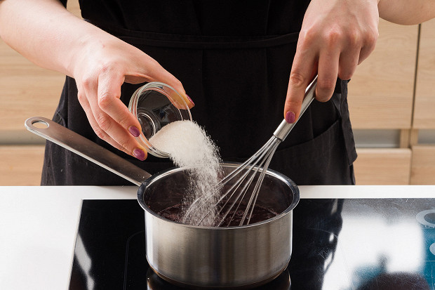 Добавьте 100 грамм сахара, поставьте смесь на плиту и нагрейте до 60 градусов. Снимите вишневую смесь с огня и тщательно размешайте, чтобы желатин полностью растворился. Если остались комочки, пропустите смесь через мелкое сито. Дайте желатиновой смеси остыть, не давая застыть.