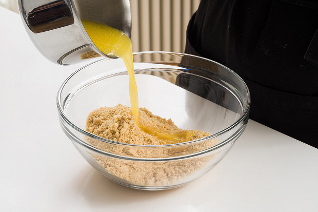 В миске перемешайте орехи и печенье. Залейте растопленным маслом и вымесите до состояния влажной крошки.