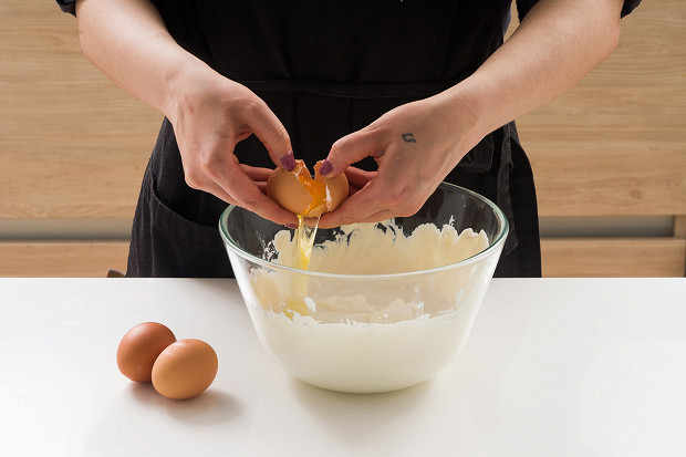 По одному вмешайте 3 яйца, каждый раз вымешивая массу до однородности, но не взбивая слишком сильно.