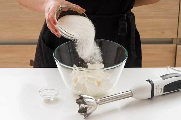 Приготовьте начинку. 400 грамм творога смешайте с 200 граммами сахара и 1 пакетиком ванильного сахара, взбейте блендером до однородной, гладкой консистенции. Сахар должен полностью раствориться.