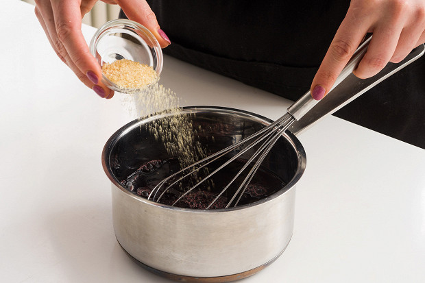 Приготовьте желе. Вишневый сок (400 мл) вылейте в сотейник, добавьте желатин (10 г) и оставьте на 10 минут.
