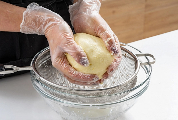 Теперь нужно собрать сгустки масла в общий ком и переложить на сито.