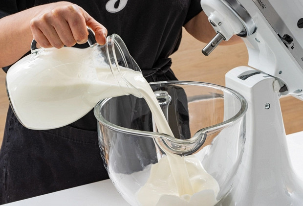 Влейте сливки в чашу миксера.