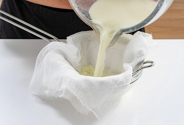 Сыворотку ни в коем случае не выливайте — процедите через двойной слой марли или через мелкое сито и слейте в отдельную емкость. На пахте можно ставить тесто для блинов и пирожков — оно получится пышным, пахта придаст ему приятный сливочный привкус.