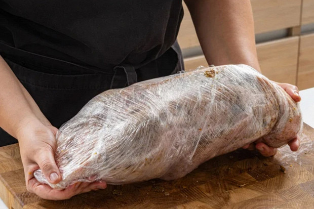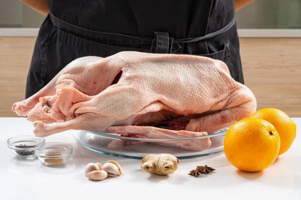 Затем оберните гуся пищевой плёнкой и уберите его мариноваться в холодильник на 8 часов.