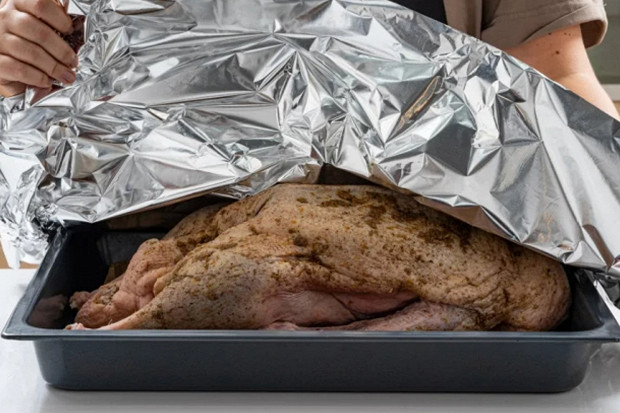 Разогрейте духовку до 180 градусов. Гуся вытащите из плёнки, положите его в глубокий противень, накройте фольгой и отправьте печься в духовку на два часа.