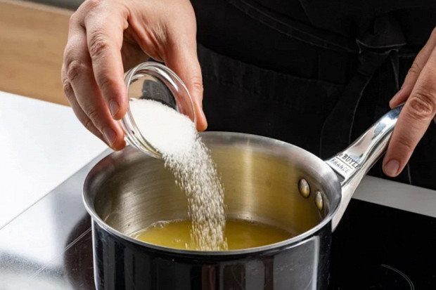 Выдавите сок из апельсинов в небольшой сотейник и уварите его с сахаром вдвое.