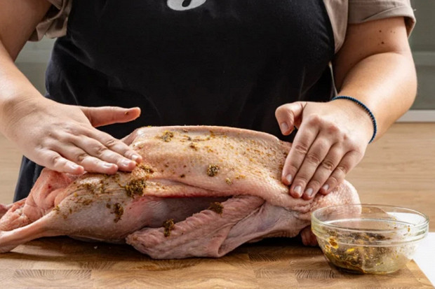 Натрите гуся получившейся имбирной пряной пастой снаружи и внутри. Натирайте хорошенько, чтобы паста не отваливалась кусками, а растёрлась по гусиной коже.