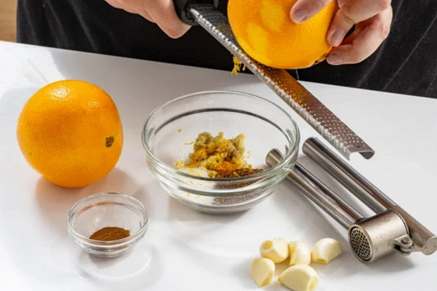 Смешайте перемолотые специи, соль, тёртый имбирь, чеснок, раздавленный с помощью пресса, и апельсиновую цедру. Превратите эту смесь в однородную массу. При необходимости добавьте совсем немного растительного масла — только для того, чтобы смесь из комковатой превратилась в гомогенную.